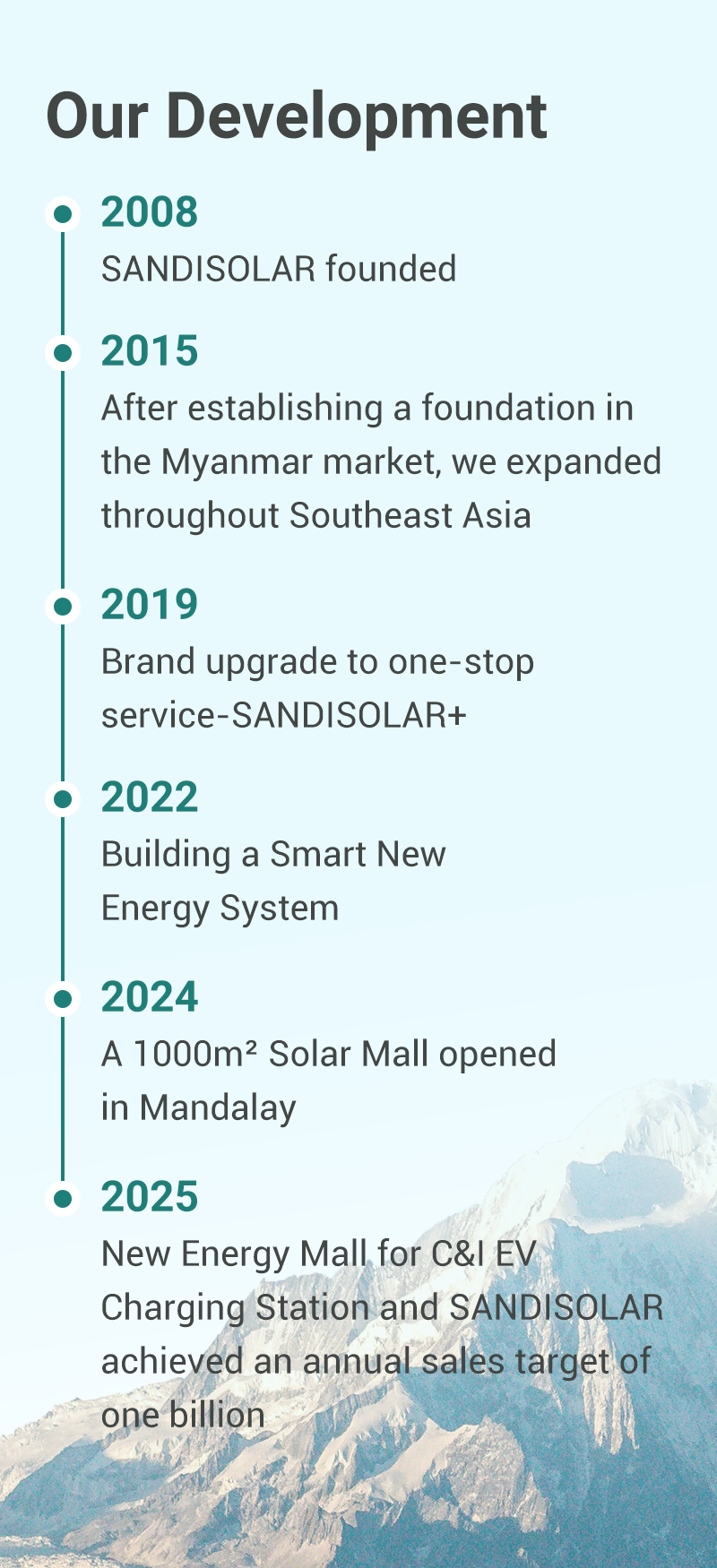 تأسست سانديسولار في 2008 وهي شركة تقنية عالية في مجال البحث, تطور, إنتاج, وبيع منتجات مثل وحدات الطاقة الشمسية, العاكسون, البطاريات, طاقة, أنظمة التخزين, شحن المركبات الكهربائية, وتطبيقات الطاقة الجديدة. الاستفادة من المنتجات الرائدة في الصناعة ونظام إدارة الطاقة الذكي, لقد اخترقت شركتنا أسواق الطاقة الجديدة في ميانمار وتايلاند, وتقدم عددا لا يحصى من المنازل والقطاع الصناعي & المشاريع التجارية: حل متكامل للطاقة يغطي كل شيء "تخزين الطاقة الشمسية - الشحن" Spectrum—يجلب فعلا الطاقة النظيفة لآلاف المصانع.